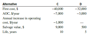 Compare the alternatives C and D on the basis of a present worth analysis using an interest rate of 10% per year and a study period of 10 years.