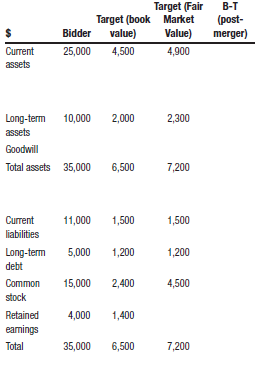 Target (Fair В-T Target (book Market value) (post- merger) Bidder Value) Current 25,000 4,500 4,900 assets Long-term 10,000 2,000 2,300 assets Goodwill Total assets 35,000 6,500 7,200 Current 11,000 1,500 1,500 liabilities Long-term debt 5,000 1,200 1,200 Common 15,000 2,400 4,500 stock Retained eamings 4,000 1,400 Total 35,000 6,500 7,200