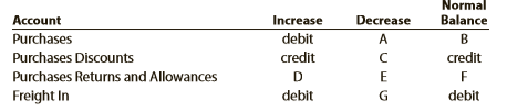 Normal Account Increase Decrease Balance Purchases debit A B Purchases Discounts credit credit Purchases Returns and Allowances D. F Freight In debit debit