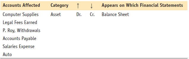 Accounts Affected Category ↑ Appears on Which Financial Statements Computer Supplies Asset Dr. Cr. Balance Sheet Legal Fees Earned P. Roy, Withdrawals Accounts Payable Salaries Expense Auto
