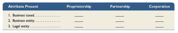 Complete the following table with either a yes or no regarding the attributes of a proprietorship, partnership and corporation.