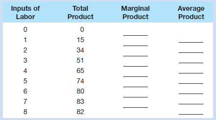 Inputs of Total Marginal Average Labor Product Product Product 1 15 2 34 3 51 4 65 5 74 6 80 7 83 8 82 ||