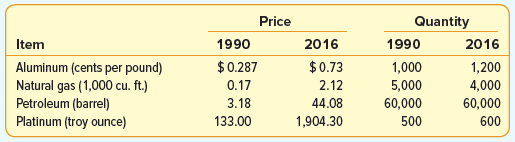 > Determine a value index for 2016 using 1990 as the base period. Use the following price information for selected items for 1990 and 2016. Production figures for those two periods are also given.