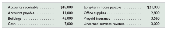 Long-term notes payable Office supplies. Accounts receivable $18,000 $21,000 .... .. ...... Accounts payable I1,000 2,800 Buildings 45,000 3,560 Prepaid insurance Unearned services revenue Cash 7,000 3,000