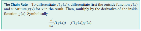The Chain Rule To differentiate f(g(x)), differentiate first the outside function f(x) and substitute g(x) for x in the result. Then, multiply by the derivative of the inside function g(x). Symbolically, −f(g(x)) = f'(g(x))g'(x). dx 1(8(x)) = }