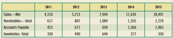 2011 2012 2013 2014 2015 Sales Net Receivables Total 4,310 5,213 7,944 11,639 18,491 617 807 1,089 1,355 2,229 Accounts Payable 425 671 699 1,560 2,465 Inventories–Total 330 440 644 377 350