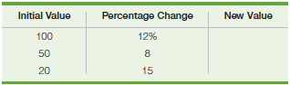 Initial Value Percentage Change New Value 100 12% 50 8 20 15