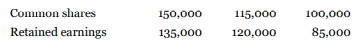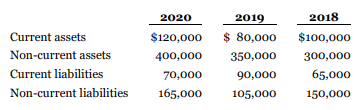 2020 2019 2018 Current assets $120,000 $ 80,000 $100,000 Non-current assets 400,000 350,000 300,000 Current liabilities 70,000 90,000 65,000 Non-current liabilities 165,000 105,000 150,000 Common shares 150,000 115,000 100,000 Retained earnings 135,000 120,000 85,000