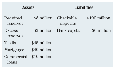 Assets Liabilities $8 million Checkable deposits $3 million Bank capital Required $100 million reserves Excess $6 million reserves T-bills $45 million Mortgages $40 million Commercial $10 million loans
