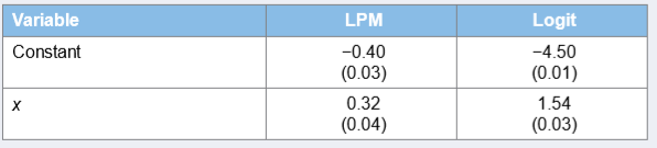 Consider a binary response variable y and an explanatory variable x. The following table contains the parameter estimates of the linear probability model (LPM) and the logit model, with the associated p-values shown in parentheses.