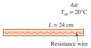 > A 300-W cylindrical resistance heater is 0.75 m long and 0.5 cm in diameter. The resistance wire is placed horizontally in a fluid at 20°C. Determine the outer surface temperature of the resistance wire in steady operation if the fluid is (a) air and (b)