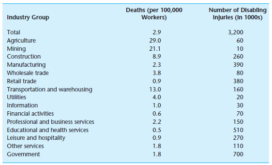 Deaths (per 100,000 Workers) Number of DIsablng Injurles (In 1000s) Industry Group Total 2.9 3,200 29.0 Agriculture Mining 60 21.1 10 Construction 8.9 260 Manufacturing 2.3 390 Wholesale trade 3.8 80 Retail trade 0.9 380 Transportation and warehousing Utilities 13.0 160 4.0 20 Information 1.0 30 Financial activities 0.6 70 Professional and business services 2.2 150 Educational and health services 0.5 510 Leisure and hospitality Other services 0.9 270 1.8 110 Government 1.8 700