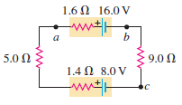 > The circuit shown in Fig. E25.33 contains two batteries, each with an emf and an internal resistance, and two resistors. Find Fig. E25.33: (a) the current in the circuit (magnitude and direction) and (b) the terminal voltage Vab of the 16.0-V batter