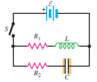 Consider the circuit shown in Fig. P30.71. Switch S is closed at time t = 0, causing a current i1 through the inductive branch and a current i2 through the capacitive branch. The initial charge on the capacitor is zero, and the charge at time t is q2.