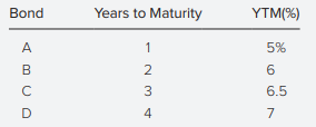 > The following table shows yields to maturity of zero-coupon Treasury securities. Term to Maturity (years) Yield to Maturity (%) 1……………………………………………3.50% 2………………………………………….4.50 3………………………………………….5.00 4………………………………………….5.50 5………………………………………….6.00 10………………