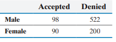 Consider the following contingency table, which relates the number of applicants accepted to a college and gender.