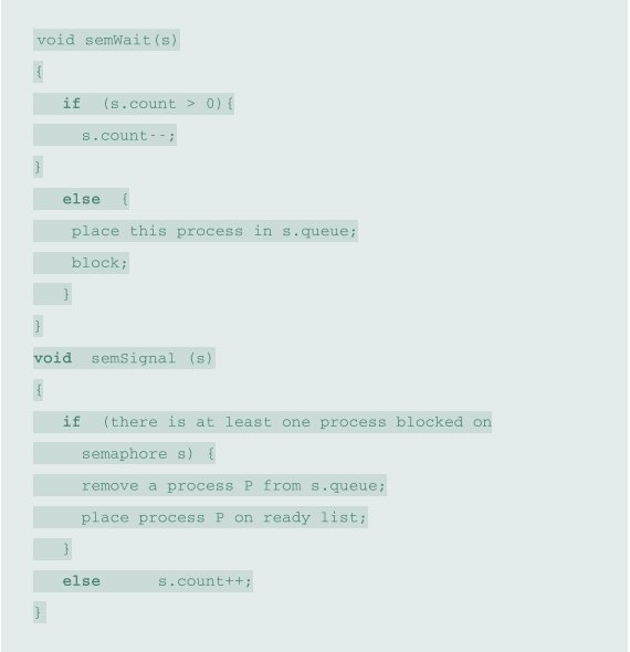 > It should be possible to implement general semaphores using binary semaphores. We can use the operations semWaitB and semSignalB and two binary semaphores, delay and mutex. Consider the following: Initially, (s) is set to the desired semaphore value. Ea