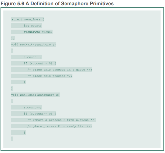 Compare this set of definitions with that of Figure 5.6. Note one difference: With the preceding definition, a semaphore can never take on a negative value. Is there any difference in the effect of the two sets of definitions when used in programs? That is, could you substitute one set for the other without altering the meaning of the program?