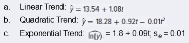 a. Linear Trend: ŷ = 13.54 + 1.08t b. Quadratic Trend: ŷ = 18.28 + 0.92t – 0.012 = 1.8 + 0.09t; se = 0.01 Inly) %3D c. Exponential Trend: