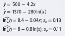 ŷ = 500 – 4.2x ŷ = 1370 – In() = 8.4 – 0.04x; s, = 0.13 280 In(x) In() = 8 – 0.81n(X); So= 0.11