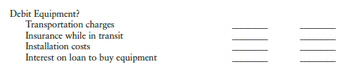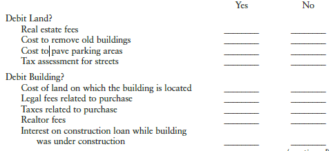 Consider the following list of expenditures and indicate whether each would be debited to Land, Building, or Equipment as part of the cost to purchase these assets. Place a check mark in the appropriate column.