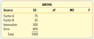 ANOVA Source df MS F Factor A 75 Factor B 25 Interaction 300 Error 600 Total 1000