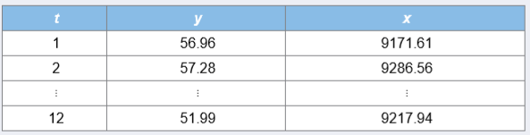 > Consider the following portion of data on y and x. a. Estimate yt = β0 + β1xt−1 + εt to make a one-step-ahead forecast for period 13. b. Estimate yt = β0 + β1ytâˆ