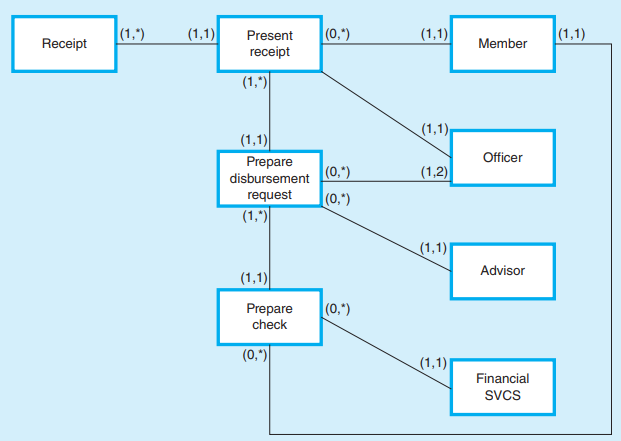 |(1,*) (1,1) (0,") (1,1) Present receipt (1,1) Receipt Member (1,*) (1,1) (1,1) Prepare Officer (0,") (1,2) disbursement request (0,") (1,*) (1,1)| Advisor (1,1) Prepare check |(0,") (0,“) (1,1) Financial svcs