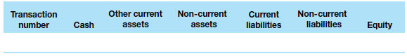 Transaction number Cash Other current assets Non-current assets Current liabilities Non-current liabilities Equity