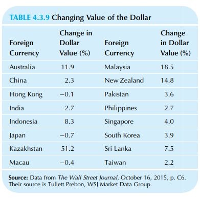 TABLE 4.3.9 Changing Value of the Dollar Change in Dollar Change in Dollar Foreign Currency Foreign Currency Value (%) Value (%) Australia 11.9 Malaysia 18.5 China 2.3 New Zealand 14.8 Hong Kong -0.1 Pakistan 3.6 India 2.7 Philippines 2.7 Indonesia 8.3 Singapore 4.0 Japan -0.7 South Korea 3.9 Kazakhstan 51.2 Sri Lanka 7.5 Масau -0.4 Taiwan 2.2 Source: Data from The Wall Street Journal, October 16, 2015, p. C6. Their source is Tullett Prebon, WSJ Market Data Group.