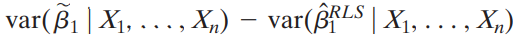 e. Compare the conditional variance of b^RLS1 in (d) to the conditional variance of the OLS estimator b^1 (from the regression including an intercept) under the GaussâMarkov conditions. Which estimator is more efficient? Use the formulas for the variances to explain why.