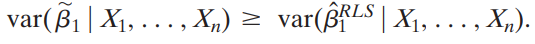 e. Compare the conditional variance of b^RLS1 in (d) to the conditional variance of the OLS estimator b^1 (from the regression including an intercept) under the Gauss–Markov conditions. Which estimator is more efficient? Use the formulas for the variances to explain why.