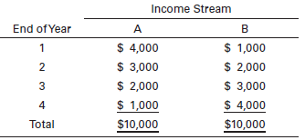 Income Stream End of Year A B $ 4,000 $ 3,000 $ 2,000 $ 1,000 $ 1,000 $ 2,000 $ 3,000 $ 4,000 1 3 Total $10,000 $10,000 4.