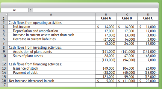 > Consider three independent cases for the cash flows of Winter Merchandising Corporation. For each case, identify from the statement of cash flows how the company generated the cash to acquire new plant assets. Rank the three cases from the most healthy f