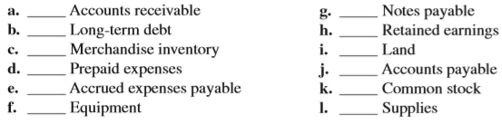 Notes payable Retained earnings a. Accounts receivable g. h. Long-term debt Merchandise inventory Prepaid expenses Accrued expenses payable Equipment b. с. i. Land d. j. k. Accounts payable е. Common stock f. 1. Supplies