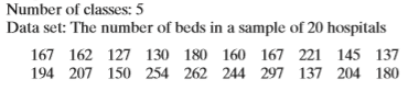 Number of classes: 5 Data set: The number of beds in a sample of 20 hospitals 167 162 127 130 180 160 167 221 145 137 194 207 150 254 262 244 297 137 204 180