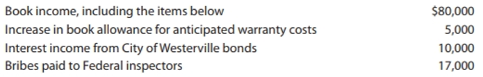 Book income, including the items below $80,000 Increase in book allowance for anticipated warranty costs 5,000 Interest income from City of Westerville bonds 10,000 Bribes paid to Federal inspectors 17,000