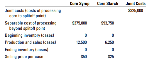 Corn Syrup Corn Starch Joint Costs Joint costs (costs of processing corn to splitoff point) $325,000 Separable cost of processing beyond splitoff point $375,000 $93,750 Beginning inventory (cases) Production and sales (cases) 12,500 6,250 Ending inventory (cases) Selling price per case $50 $25