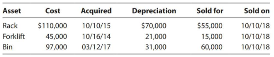 Asset Cost Acquired Depreciation Sold for Sold on Rack $110,000 10/10/15 $70,000 $55,000 10/10/18 Forklift 45,000 10/16/14 21,000 15,000 10/10/18 Bin 97,000 03/12/17 31,000 60,000 10/10/18