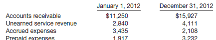 Corinne Dunbar, M.D., maintains the accounting records of Dunbar Clinic on a cash basis. During 2012, Dr. Dunbar collected $142,600 from her patients and paid $60,470 in expenses. At January 1, 2012, and December 31, 2012, she had accounts receivable, unearned service revenue, accrued expenses, and prepaid expenses as follows. (All long-lived assets are rented.)