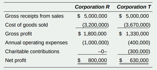 Corporation R Corporation T Gross receipts from sales $ 5,000,000 $ 5,000,000 (3,670,000) $ 1,330,000 Cost of goods sold (3,200,000) Gross profit $ 1,800,000 Annual operating expenses (1,000,000) (400,000) Charitable contributions -0- (300,000) Net profit 2$ 800,000 630,000
