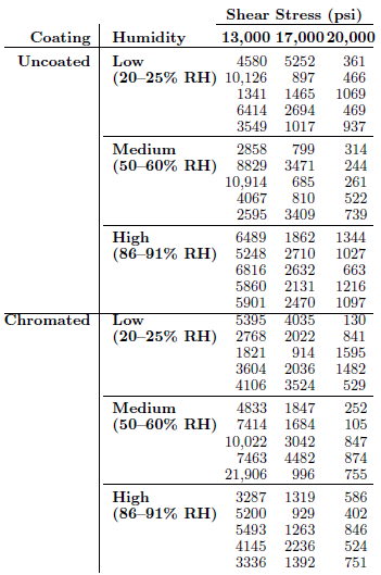 Corrosion fatigue in metals has been defined as the simultaneous action of cyclic stress and chemical attack on a metal structure. In the study Effect of Humidity and Several Surface Coatings on the Fatigue Life of 2024-T351 Aluminum Alloy, conducted by the Department of Mechanical Engineering at Virginia Tech, a technique involving the application of a protective chromate coating was used to minimize corrosion fatigue damage in aluminum. Three factors were used in the investigation, with 5 replicates for each treatment combination: coating, at 2 levels, and humidity and shear stress, both with 3 levels. The fatigue data, recorded in thousands of cycles to failure, are presented here.