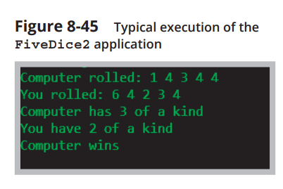 For this game, the dice values do not count; for example, if both players have three of a kind, itâs a tie, no matter what the values of the three dice are. Additionally, the game does not recognize other poker hand combinations such as a full house (three of a kind plus two of a kind) or a straight (sequential values). Figure 8-45 shows a sample execution. Save the application as FiveDice2.java.