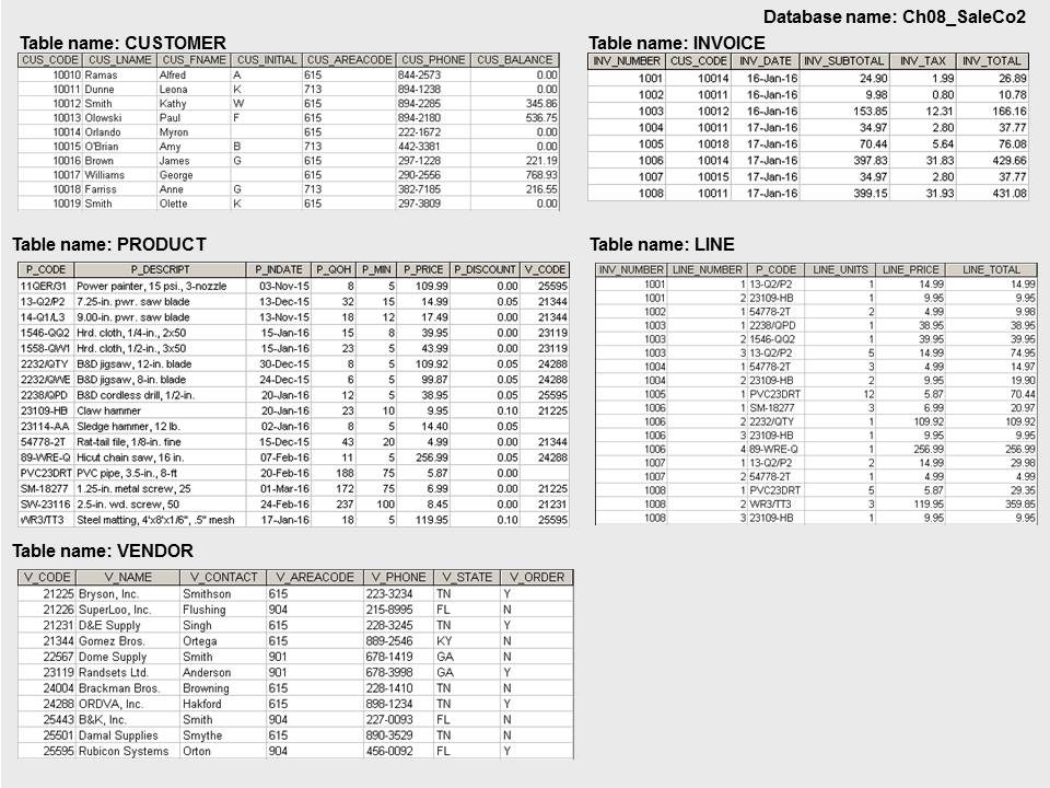 Database name: Ch08_SaleCo2 Table name: CUSTOMER CUS CODE CUS_LNAME CUS_FNAME CUS_INITIAL CUS AREACODE CUS PHONE CUS_BALANCE Table name: INVOICE NV_NUMBER CUS_CODE INV_DATE INV_SUBTOTAL INV TAX INV_TOTAL 10010 Ramas Alfred A 615 844-2573 0.00 16-Jan-16 16-Jan-16 1001 10014 24.90 1.99 26.89 10011 Dunne Leona K 713 894-1238 0.00 1002 10011 9.98 0.80 10.78 10012 Smith 615 894-2285 345.86 Kathy Paul 1003 10012 16-Jan-16 153.85 12.31 166.16 536.75 0.00 10013 Olowski F 615 894-2180 1004 10011 17-Jan-16 34.97 2.80 37.77 10014 Orlando 615 Мyron Amy James 222-1672 10015 OBrian B 713 442-3381 0.00 1005 10018 17-Jan-16 70.44 5.64 76.08 10016 Brown 615 297-1228 221.19 1006 10014 17-Jan-16 397.83 31.83 429.66 10017 Williams 290-2556 George Anne 615 768.93 1007 10015 17-Jan-16 34.97 2.80 37.77 10018 Farriss G 713 382-7185 216.55 1008 10011 17-Jan-16 399.15 31.93 431.08 10019 Smith Olette K 615 297-3809 0.00 Table name: PRODUCT Table name: LINE P_INDATE P_QOH P_MIN P_PRICE P_DISCOUNT V_CODE 109.99 INV_NUMBER LINE_NUMBER P_CODE 11QERI31 Power painter, 15 psi., 3-nozzle 13-Q2/P2 7.25-in. pwr. saw blade P_DESCRIPT P_CODE LINE_UNITS LINE_PRICE LINE_TOTAL 03-Nov-15 5 0.00 25595 1001 1 13-02/P2 1 14.99 14.99 13-Dec-15 32 15 14.99 0.05 21344 1001 2 23109-HB 1 9.95 9.95 1002 1003 1003 1003 1 54778-2T 2 4.99 38.95 39.95 9.98 38.95 39.95 74.95 14-Q1L3 9.00-in. pwr. saw blade 13-Nov-15 18 12 17.49 0.00 21344 1 2238/OPD 2 1546-002 1 1546-QQ2 Hrd. cloth, 1/4-in., 2x50 15-Jan-16 15 8. 39.95 0.00 23119 1558-QW1 Hrd. cloth, 1/2-in., 3x50 15-Jan-16 23 5 43.99 0.00 23119 3 13-02/P2 14.99 2232/QTY B&D jigsaw, 12-in. blade 30-Dec-15 109.92 0.05 24288 1004 154778-2T 2 23109-HB 3 4.99 14.97 2232/GVE B&D jigsaw, 8-in. blade 24-Dec-15 6 5 99.87 0.05 24288 1004 2 9.95 19.90 2238/OPD B8D cordless drill, 1/2-in. 25595 1005 1 PVC23DRT 1 SM-18277 20-Jan-16 12 5 38.95 0.05 12 5.87 70.44 23109-HB Clavw hammer 20-Jan-16 23 10 9.95 0.10 21225 1006 3 6.99 20.97 1006 2 2232/QTY 109.92 109.92 23114-AA Sledge hammer, 12 lb. 54778-2T Rat-tail file, 18-in. fine 89-WRE-Q Hicut chain saw, 16 in. PVC23DRT PVC pipe, 3.5-in., 8-ft 02-Jan-16 14.40 0.05 1006 1006 3 23109-НB 4 89-WRE-Q 1 9.95 256.99 9.95 15-Dec-15 43 20 4.99 0.00 21344 1 256.99 07-Feb-16 11 256.99 0.05 24288 1007 1007 1 13-02/P2 14.99 29.98 20-Feb-16 188 75 5.87 0.00 254778-2T 4.99 4.99 SM-18277 1.25-in. metal screw, 25 01-Mar-16 172 75 6.99 0.00 21225 1008 1 PVC23DRT 5.87 29.35 SW-23116 2.5-in. wd. screw, 50 24-Feb-16 237 100 8.45 0.00 21231 1008 2 WR3/TT3 119.95 359.85 WR3/TT3 Steel matting, 4x8'x16", 5" mesh 17-Jan-16 18 5 119.95 0.10 25595 1008 3 23109-HB 1 9.95 9.95 Table name: VENDOR V CODE 21225 Bryson, Inc. 21226 SuperLoo, Inc. 21231 D&E Supply V NAME V_CONTACT V_AREACODE V_PHONE V_STATE V_ORDER Smithson 615 223-3234 TN Y 904 Flushing Singh Ortega Smith 215-8995 FL 615 228-3245 TN 21344 Gomez Bros. 615 889-2546 KY 22567 Dome Supply 901 678-1419 GA N 23119 Randsets Ltd. Anderson 901 678-3998 GA Y 24004 Brackman Bros. Browning 615 228-1410 TN N 24288 ORDVA, Inc. 25443 B&K, Inc. 25501 Damal Supplies 25595 Rubicon Systems Orton Hakford 615 898-1234 TN Smith 904 227-0093 FL N Smythe 615 890-3529 TN 904 456-0092 FL Y 1-