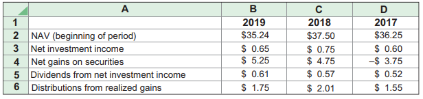 Create a spreadsheet model similar to the spreadsheet for Table 12.2, which you can view at www.pearson.com/mylab/finance, to analyze the following three years of data relating to the MoMoney Mutual Fund. It should report the amount of dividend income and capital gains distributed to the shareholders, along with any other changes in the fundâs net asset value (b = 0.5).