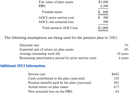 > The following information pertains to Kane Company’s defined benefit pension plan: Kane has no net actuarial gains or losses in AOCI at January 1, 20X1. Required: In its December 31, 20X1, balance sheet, what amount should Kane report
