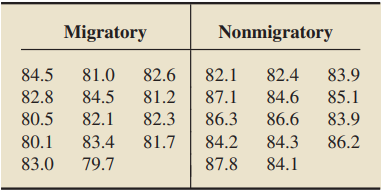 D. Cristol et al. published results of their studies of two subspecies of dark-eyed juncos in the article “Migratory Dark-Eyed Juncos, Junco Hyemalis, Have Better Spatial Memory and Denser Hippocampal Neurons than Nonmigratory Conspecifics” (Animal Behaviour, Vol. 66, pp. 317–328). One of the subspecies migrates each year, and the other does not migrate. Several physical characteristics of 14 birds of each subspecies were measured, one of which was wing length. The following data, based on results obtained by the researchers, provide the wing lengths, in millimeters (mm), for the samples of two subspecies.