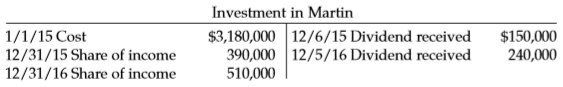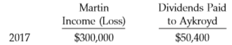 Investment in Martin 1/1/15 Cost 12/31/15 Share of income 12/31/16 Share of income $3,180,000 12/6/15 Dividend received 390,000 12/5/16 Dividend received 510,000 $150,000 240,000 Martin Dividends Paid Income (Loss) to Aykroyd 2017 $300,000 $50,400