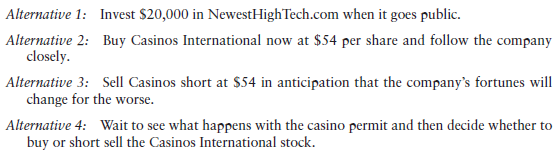 Alternative 1: Invest $20,000 in NewestHighTech.com when it goes public. Alternative 2: Buy Casinos International now at $54 per share and follow the company closely. Alternative 3: Sell Casinos short at $54 in anticipation that the company's fortunes will change for the worse. Alternative 4: Wait to see what happens with the casino permit and then decide whether to buy or short sell the Casinos International stock.