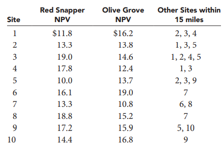 Darren Restaurants owns and operates several different restaurant chains including Red Snapper and the Olive Grove. The company is considering opening a number of new units in Ohio. There are 10 different sites available for the company to build new restaurants and the company can build either type of restaurant at a given site. The following table summarizes the estimated net present value (NPV) of the cash flows (in millions) resulting from locating each type of restaurant at each of the sites and also indicates which sites are within 15 miles of each other.